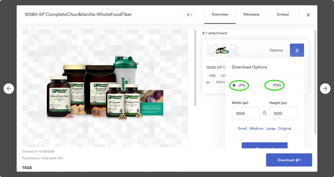 When you find the product image you want, hover over the image and click "View." From there, you can download the file as a JPG (white background) or PNG (transparent background).